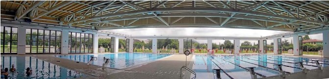 La progettazione costruttiva in capo al nostro studio ha consentito di produrre contemporaneamente in tre stabilimenti le strutture, conseguendo un notevole risparmio dei tempi di realizzazione dell’opera. Il tetto, il quale ha una luce di 40 m, è motorizzato e scorre sulla copertura del corpo servizi: in tale modo il piano vasca è completamente esposto al sole.